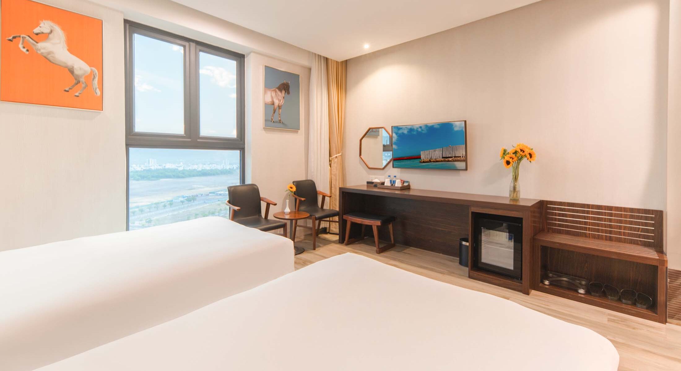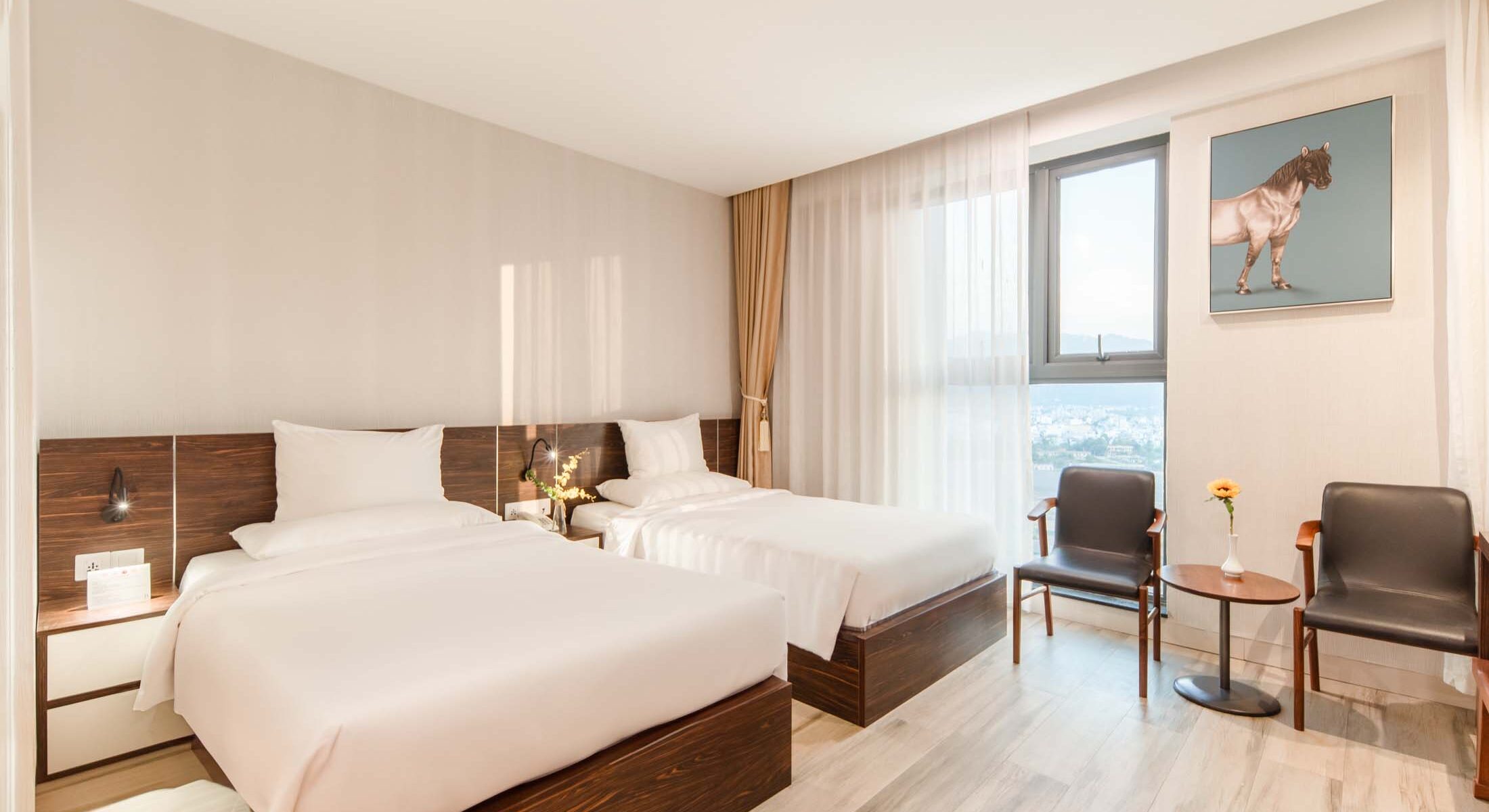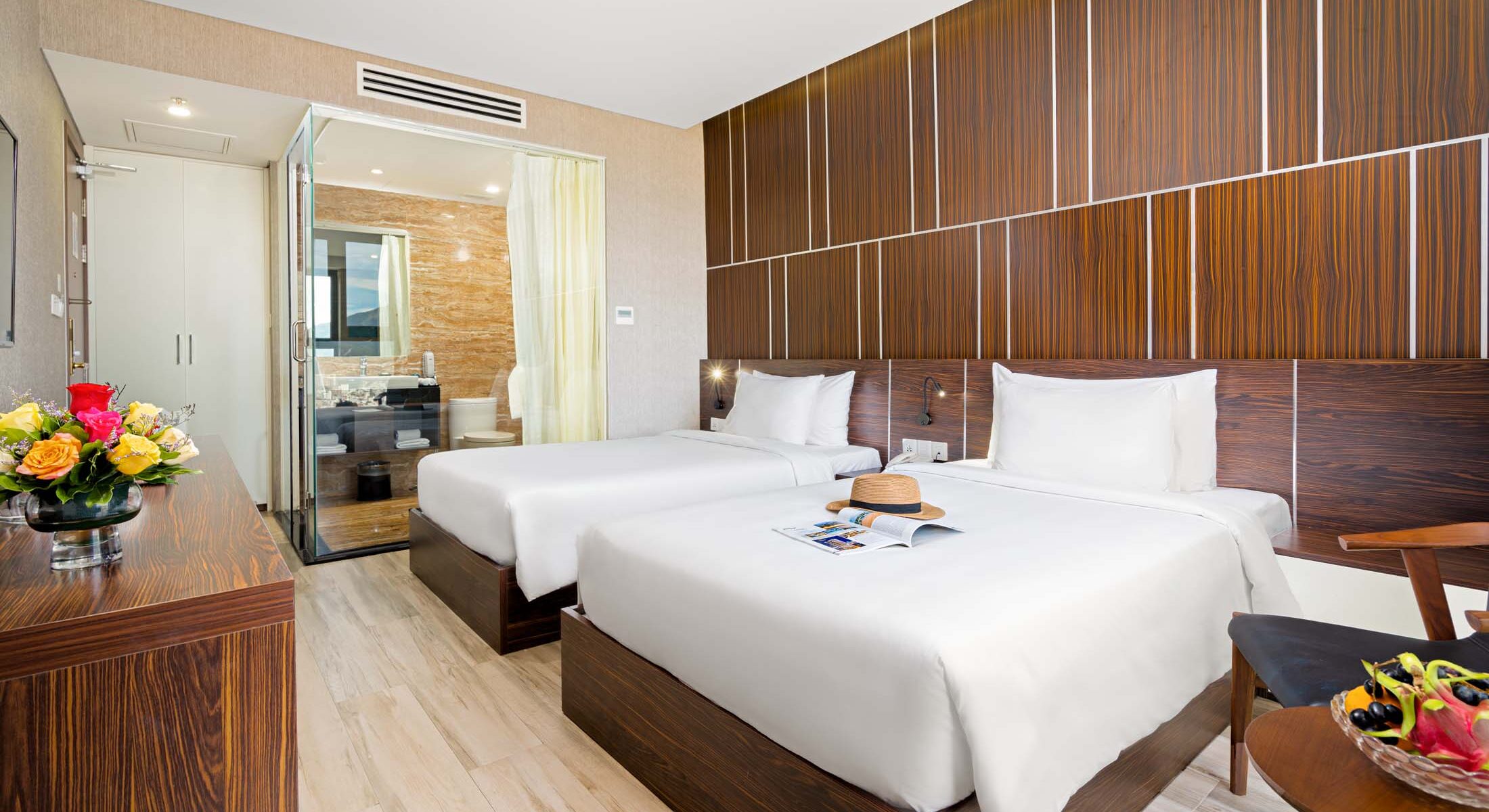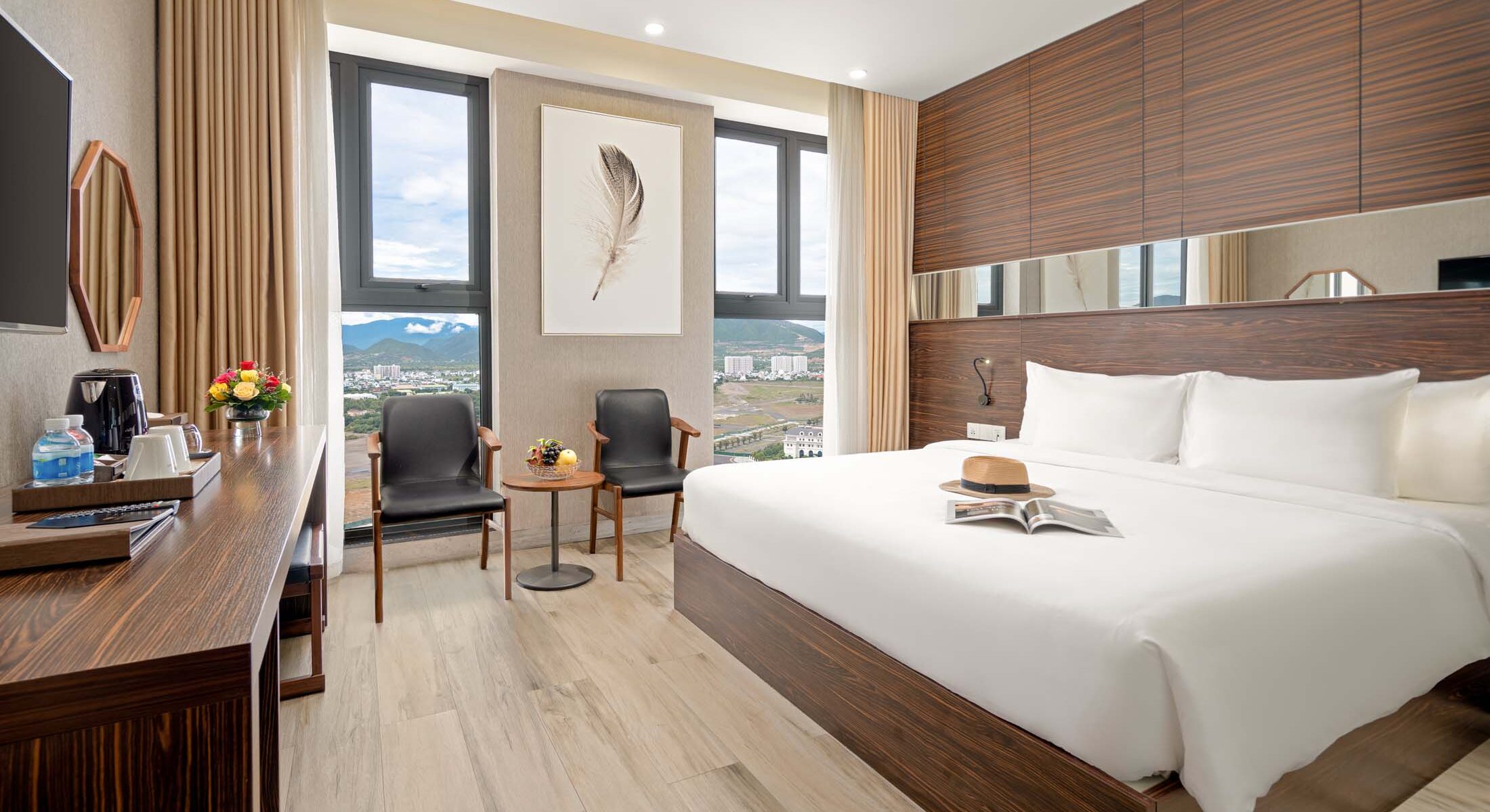 The Deluxe Room blends modern elegance with serene comfort, featuring an open layout and a graceful glass-partitioned bathroom. Large windows invite natural light and offer views of the mountains and cityscape, creating a bright, tranquil ambiance. Thoughtfully curated with premium furnishings and warm lighting, it is the perfect retreat to relax and unwind in Nha Trang.