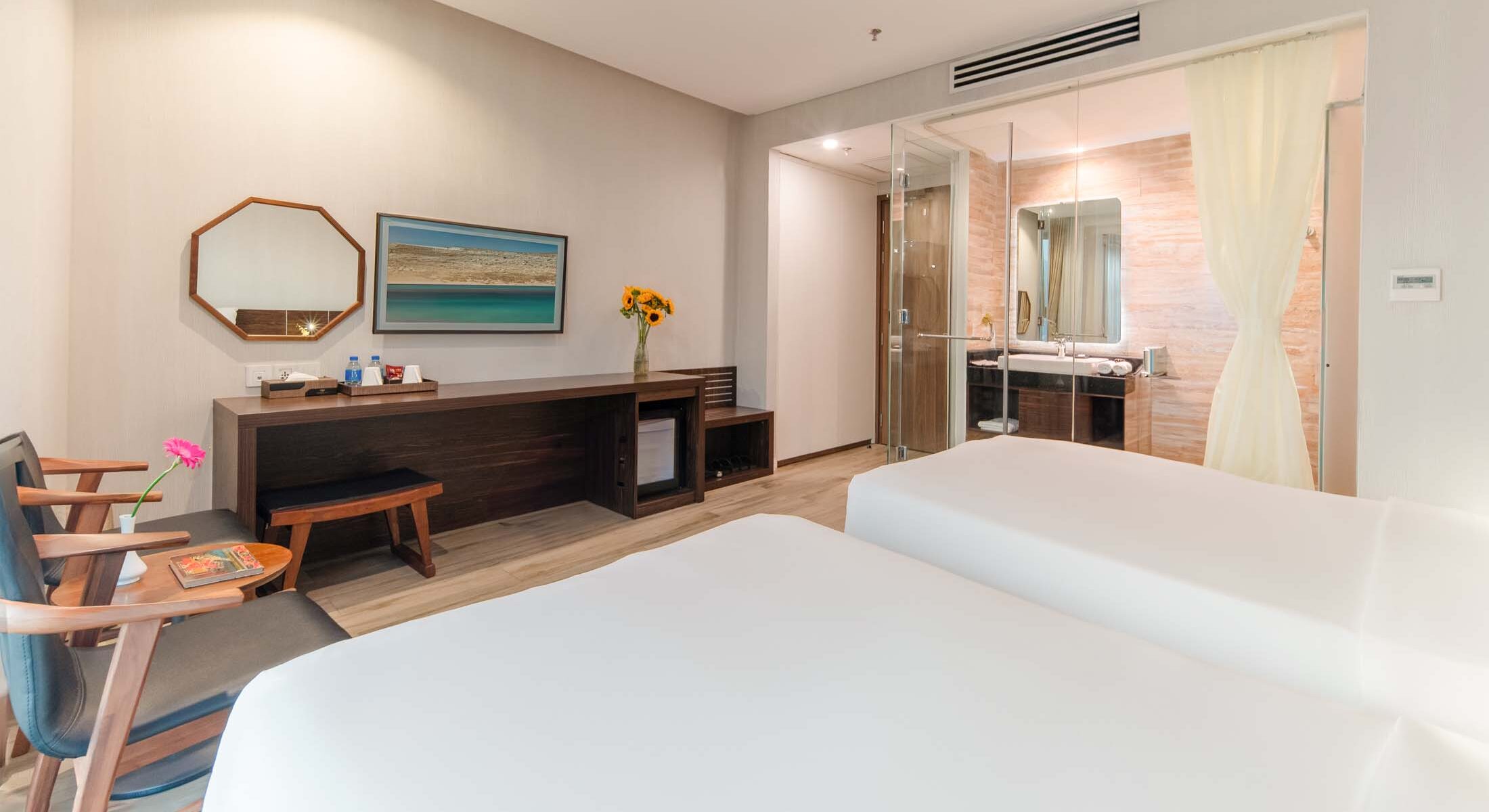 Phòng Deluxe là sự hòa quyện tinh tế giữa hiện đại và thư thái, với không gian mở và vách kính nhẹ giữa phòng ngủ và phòng tắm. Cửa sổ lớn đón ánh sáng tự nhiên, hướng đồi núi và thành phố, tạo cảm giác thoáng đãng, dễ chịu. Nội thất cao cấp cùng ánh sáng ấm áp mang đến không gian lưu trú lý tưởng để thư giãn tại Nha Trang.